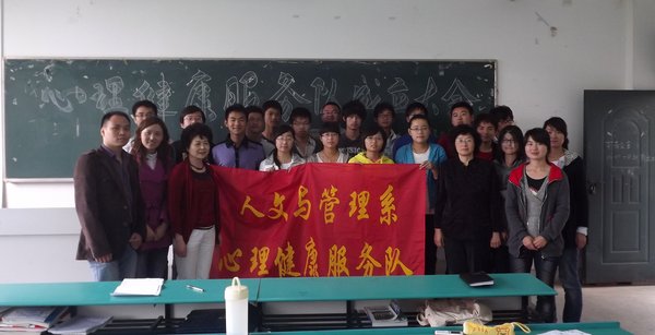 为响应五月大学生心理健康教育宣传周“珍爱生命,责任同行”主题,培养乐观自信、和谐发展的大学生,2011年5月25日中午,人文与管理系“心理健康志愿服务队”成立大会于西教106召开。系党总支书记阮笑芳、党总支副书记刘华、指导老师刘涛和“心理健康志愿服务队”全体队员参加了会议,会议由系团委书记吴映辉主持。