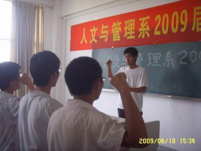 为迎接即将到来的期末考试,6月18日下午,人文与管理系08级全体学生干部在东306开展了以“诚信做人、诚信考试”为主题的考前宣誓活动,08级辅导员吴映辉老师主持了本次活动。