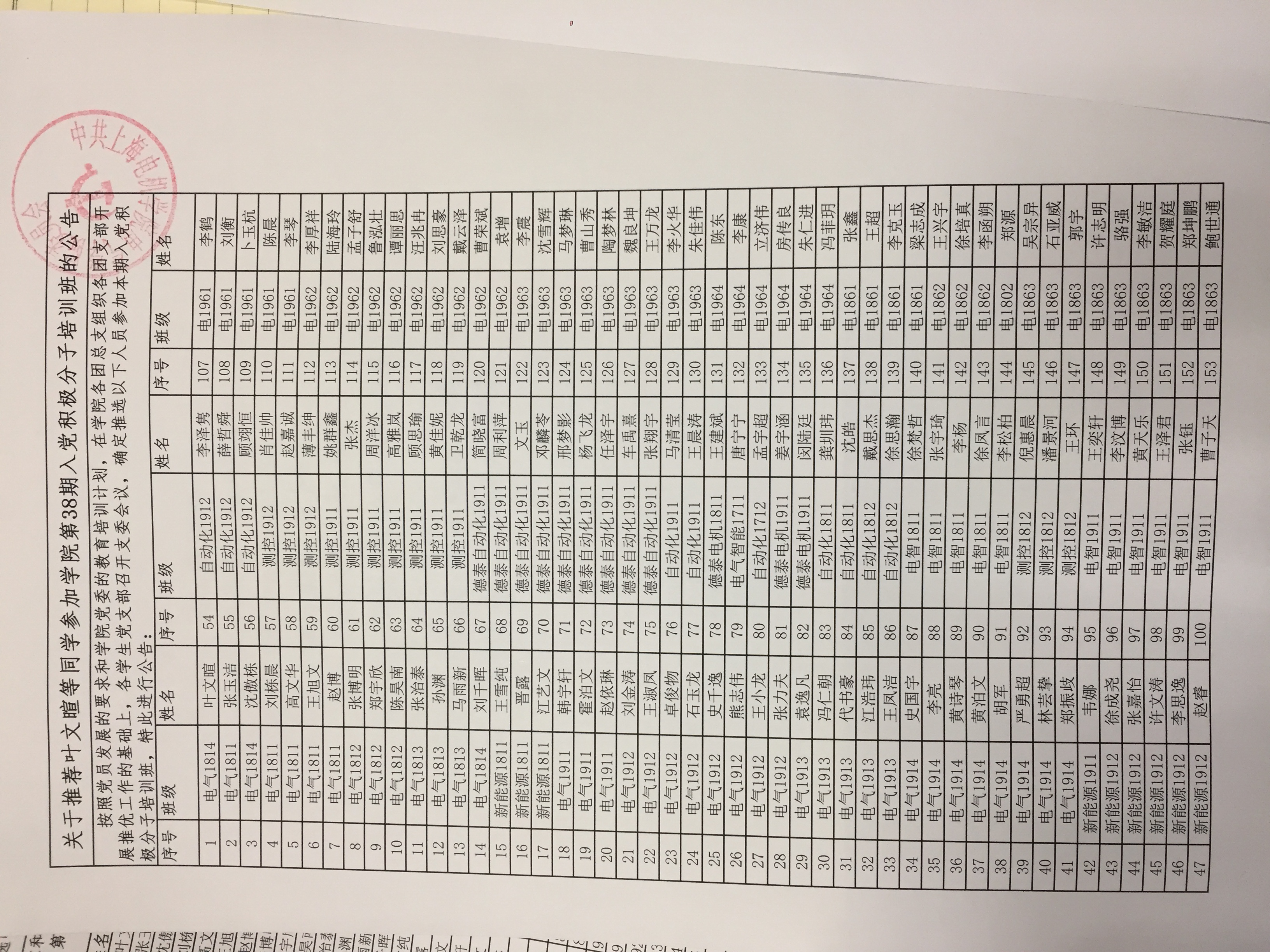 关于推荐叶文暄等同学参加学院第38期入党积极分子培训班的公告
