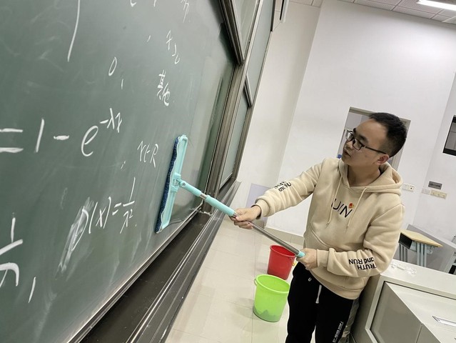 各位党员同学在教学楼阿姨的帮助下,先排摸教学楼的卫生情况,三人一组负责一栋教学楼,分别按照各自的清扫任务开始了有序打扫。党员同学拿着抹布、脸盆、扫把、簸箕等工具,打扫时认真仔细,用抹布将课桌抹干净,擦黑板时十分用心,把粉笔槽的灰尘都清理出来,还有党员蹲在地上认真清理教室地上的垃圾,不放过任何一个角落!
