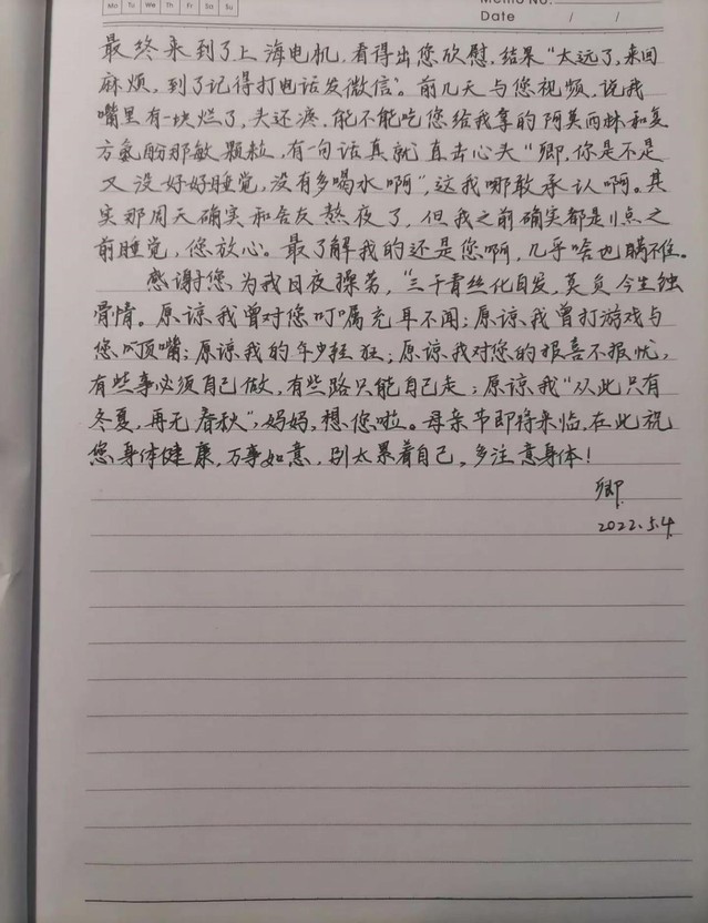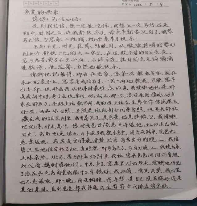 一封家书,将对妈妈的感谢和思念写在纸上。电气2113班马紫卿同学家中有五个孩子,但印象中的妈妈却总是那么温柔而从容,给他自信和力量。家书里,他回顾了十九年间与妈妈相处时的难忘时刻:第一次教他写字时的不厌其烦,获得优异成绩时的妈妈微笑,遭遇挫折时妈妈给予的鼓励……马紫卿在信中讲述了自己在校的学习和生活,也写下了平时不曾说出口的愧疚与祝福,他希望通过一封手写信,让远方的妈妈放心。