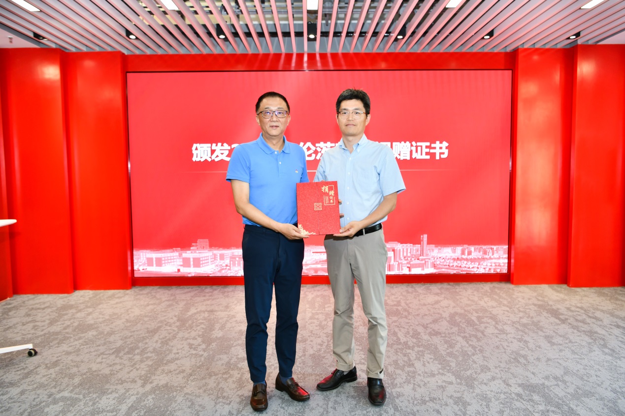 在签约仪式之前,吕小亮代表教育发展基金会向伦茨2022年捐款5357欧元赠予学校,用于购置本地的树种,共同种植 “产教融合”之树的社会担当责任表示感谢,并颁发了2022年伦茨基金捐赠证书。