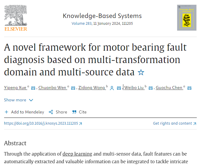 近日,kaiyun登录中国入口登录电机智能诊断研究团队从多变换域和多源数据融合的视角出发,提出了一种新的电机轴承故障诊断框架。相关研究结果以“A Novel Framework for Motor Bearing Fault Diagnosis Based on Multi-transformation Domain and Multi-source Data”为题,发表在人工智能领域重要期刊Knowledge-Based Systems(IF 8.8,中国科学院一区Top期刊)上。kaiyun官网为论文第一单位,硕士研究生薛一鹏为论文第一作者,文传博老师、陈国初老师为共同作者。